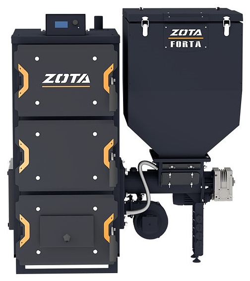 Автоматический твердотопливный котел Zota Forta-20 предназначен для теплоснабжения индивидуальных жилых домов и зданий коммунально-бытового назначения, оборудованных системой водяного отопления с принудительной или естественной циркуляцией, а также горячего водоснабжения приналичии бака косвенного нагрева. Котел состоит из топливного бункера с откидной крышкой и вертикально ориентированного рабочего корпуса из 3 секций: центральной – камерой загрузки (топкой), верхней – прочистной с S-образным теплообменником и нижней для сбора золы, каждая секция имеет распашную дверь с поворотной рукояткой-фиксатором, зольная секция имеет дополнительную откидную поддувальную дверцу с ручкой для регулирования подъема, корпус оснащен 2 патрубками для теплоносителя: входным снизу и выходным сверху, сливным патрубком, 2 отверстиями для установки дымохода и болтом для заземления, контроллер – электромеханической панелью управления и информативным дисплеем индикации с подсветкой. Кожухи выполнены из листовой стали с внешним антикоррозийным покрытием черного цвета, лоток горелки – из нержавеющей стали, рассекатель – из чугуна.