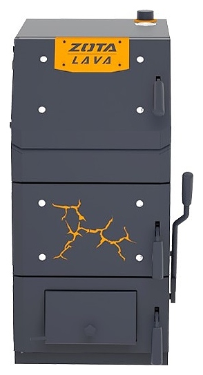 Твердотопливный котел Zota Lava-17 предназначен для теплоснабжения индивидуальных жилых домов и зданий коммунально-бытового назначения, оборудованных системой водяного отопления с принудительной или естественной циркуляцией, а также горячего водоснабжения при наличии бака косвенного нагрева. Вертикально ориентированный корпус состоит из 3 секций: верхней загрузочно-прочистной с наклонным фронтом и S-образным теплообменником в тыльной части за съемной заслонкой, центральной – камерой сгорания (топкой) с распашной шуровочной решеткой и нижней для сбора золы, каждая секция имеет распашную дверь с поворотной рукояткой-фиксатором, зольная секция имеет дополнительную откидную поддувальную дверцу с ручкой-фиксатором для регулирования подъема, корпус оснащен 2 патрубками для теплоносителя: входным снизу и выходным сверху, расположенными с тыльной стороны сливным патрубком, фланцем для установки патрубка дымохода и болтом для заземления. Кожухи выполнены из листовой стали с внешним антикоррозийным покрытием черного цвета, зубчатые пластины шуровочного механизма – из нержавеющей стали марки AISI 321.