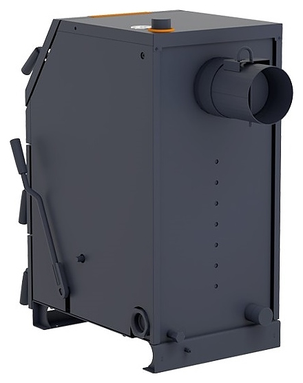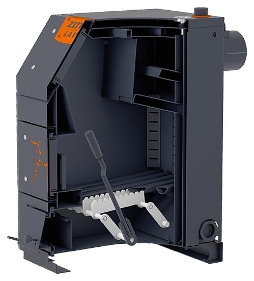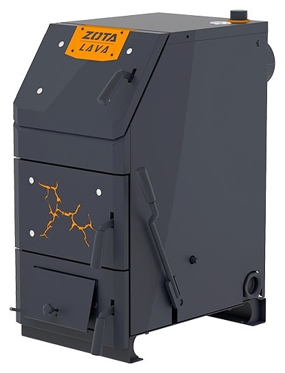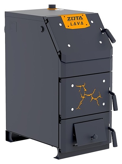 Твердотопливный котел Zota Lava-26 предназначен для теплоснабжения индивидуальных жилых домов и зданий коммунально-бытового назначения, оборудованных системой водяного отопления с принудительной или естественной циркуляцией, а также горячего водоснабжения при наличии бака косвенного нагрева. Вертикально ориентированный корпус состоит из 3 секций: верхней загрузочно-прочистной с наклонным фронтом и S-образным теплообменником в тыльной части за съемной заслонкой, центральной – камерой сгорания (топкой) с распашной шуровочной решеткой и нижней для сбора золы, каждая секция имеет распашную дверь с поворотной рукояткой-фиксатором, зольная секция имеет дополнительную откидную поддувальную дверцу с ручкой-фиксатором для регулирования подъема, корпус оснащен 2 патрубками для теплоносителя: входным снизу и выходным сверху, расположенными с тыльной стороны сливным патрубком, фланцем для установки патрубка дымохода и болтом для заземления. Кожухи выполнены из листовой стали с внешним антикоррозийным покрытием черного цвета, зубчатые пластины шуровочного механизма – из нержавеющей стали марки AISI 321.