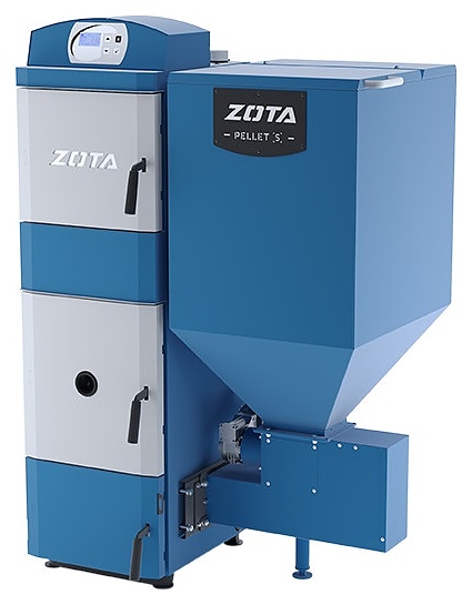 Автоматический твердотопливный котел Zota Pellet-32S предназначен для теплоснабжения индивидуальных жилых домов и зданий коммунально-бытового назначения, оборудованных системой водяного отопления с принудительной циркуляцией, а также горячего водоснабжения при наличии бака косвенного нагрева. Котел состоит из топливного бункера с откидной крышкой и вертикально ориентированного рабочего корпуса из 3 секций: центральной – камерой загрузки (топкой), верхней – прочистной с жаротрубным теплообменником большой площади и нижней для сбора золы, каждая секция имеет распашную дверь с поворотной рукояткой-фиксатором, корпус оснащен 2 патрубками для теплоносителя: входным снизу и выходным сверху, входным и выходным патрубками рециркуляции, сливным патрубком, отверстиями для установки дымохода и болтом для заземления, контроллер – панелью управления с мембранной клавиатурой и информативным жидкокристаллическим дисплеем индикации. Кожухи выполнены из листовой стали с внешним антикоррозийным покрытием в комбинации голубого и серого тонов, тарелка горелки – из нержавеющей стали, рассекатель – из чугуна.