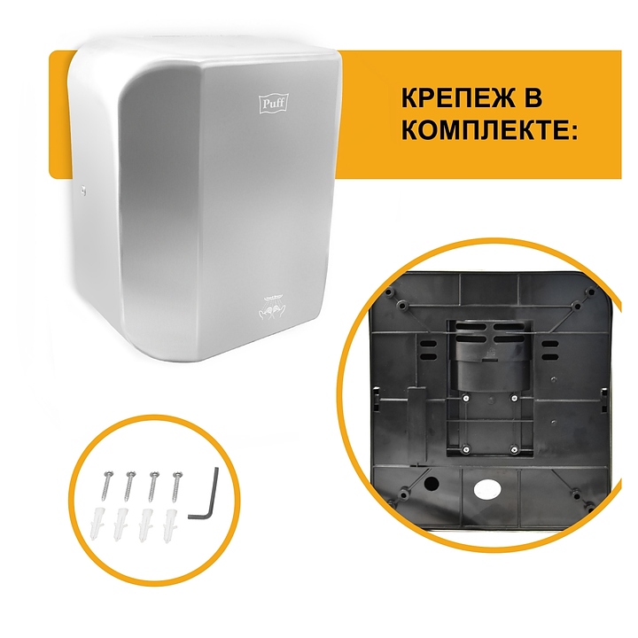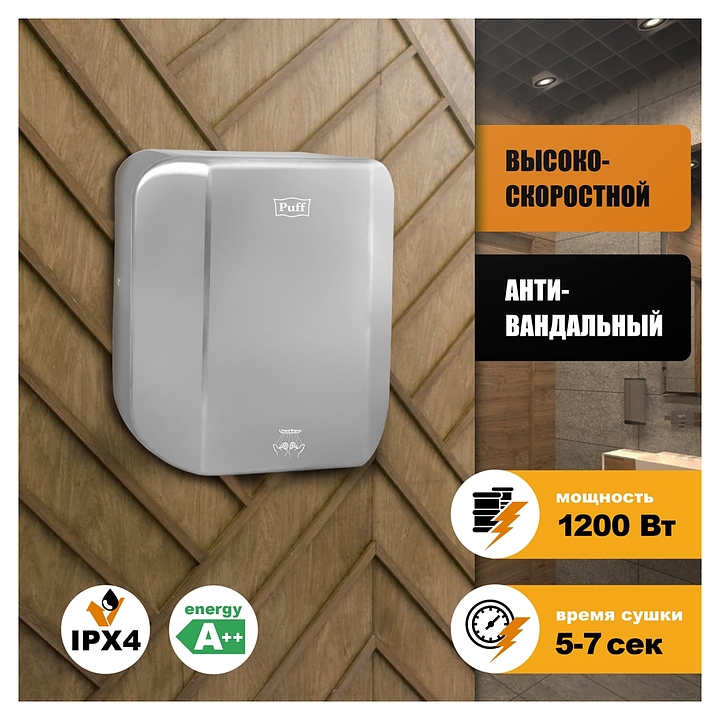 Сушилка для рук Puff 8865 используется в гостиницах, отелях, бассейнах, фитнес-клубах и спа-центрах. Прибор оснащен сенсорным управлением, а также регулировкой расстояния до сенсора. Корпус выполнен из прочной нержавеющей стали 304, что гарантирует антивандальность. В комплект поставки входит крепеж. Особенности: