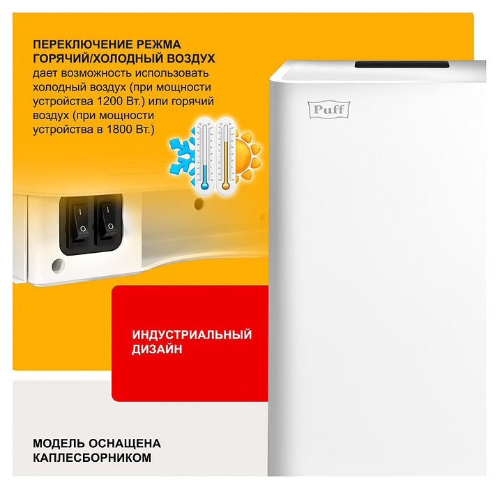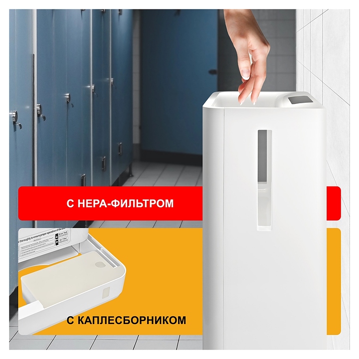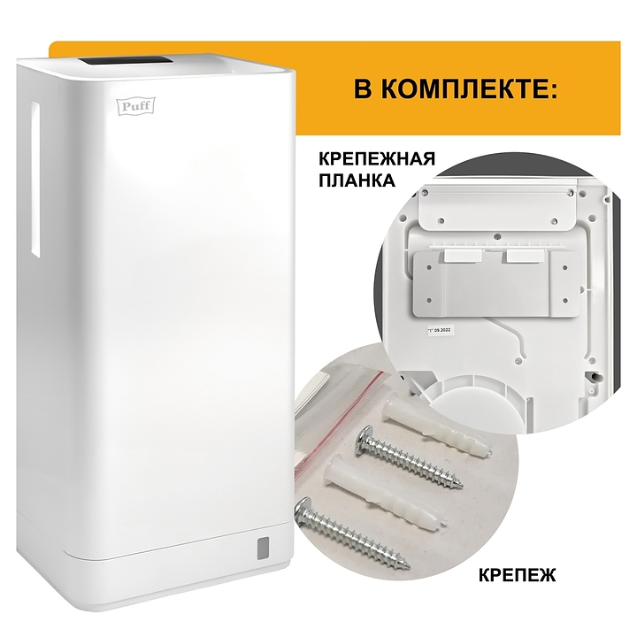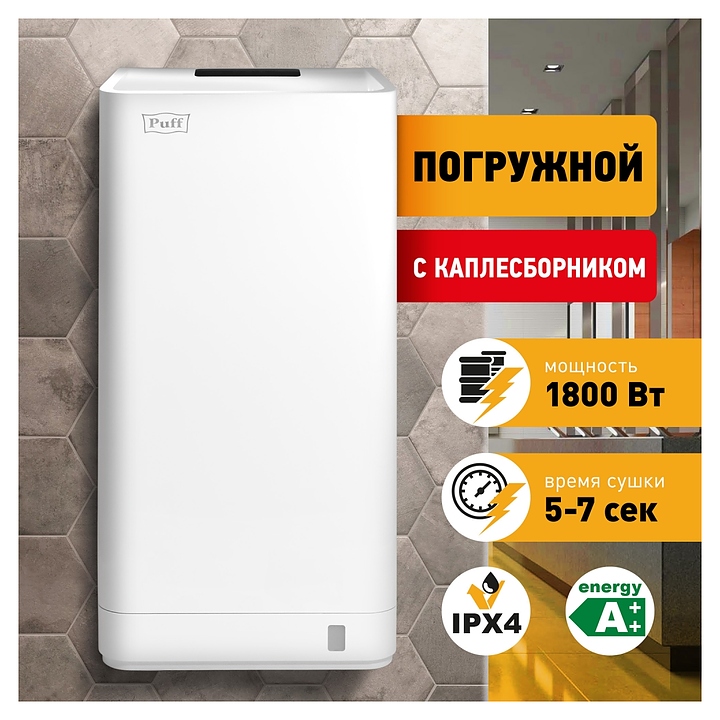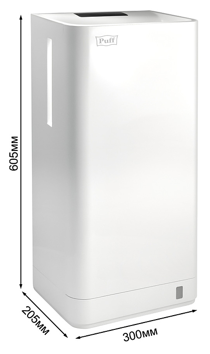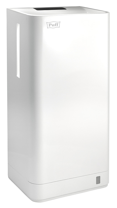 Сушилка для рук Puff 8875 используется в гостиницах, отелях, бассейнах, фитнес-клубах и спа-центрах. Прибор оснащен сенсорным управлением, HEPA-фильтром и каплесборником. Осушение рук осуществляется за счет двух узконаправленных быстрых потоков воздуха, которые сдувают воду. Переключатель холодный-горячий дает возможность использовать холодный воздух при мощности устройства 1200 Вт или горячий воздух при мощности устройства в 1800 Вт. Корпус выполнен из прочного ABS-пластика. В комплект поставки входят крепеж и крепежная планка. Особенности: