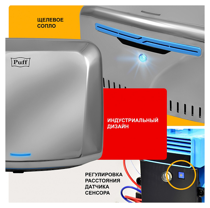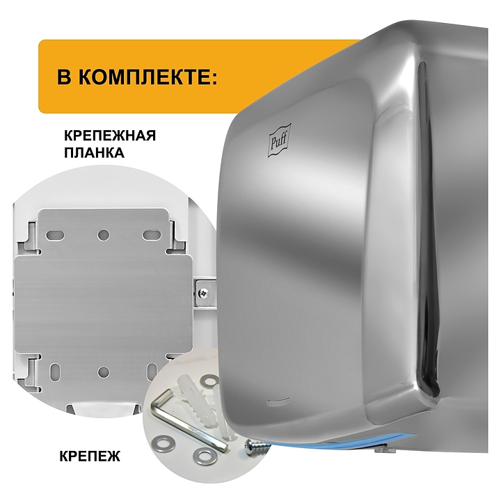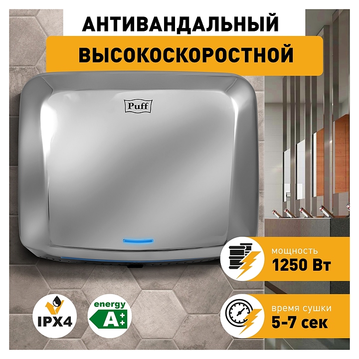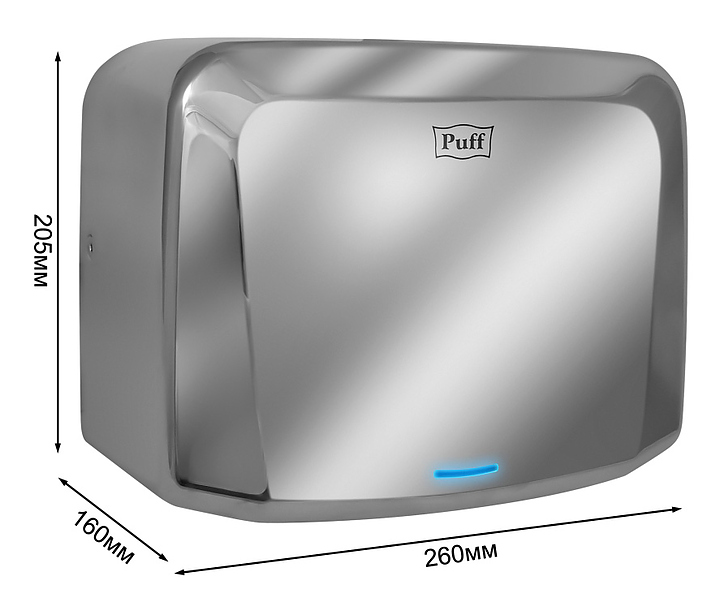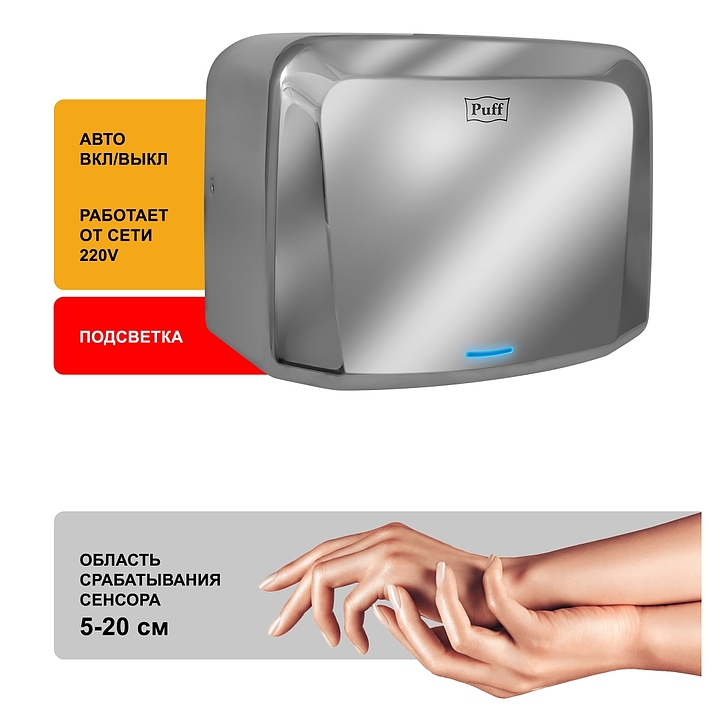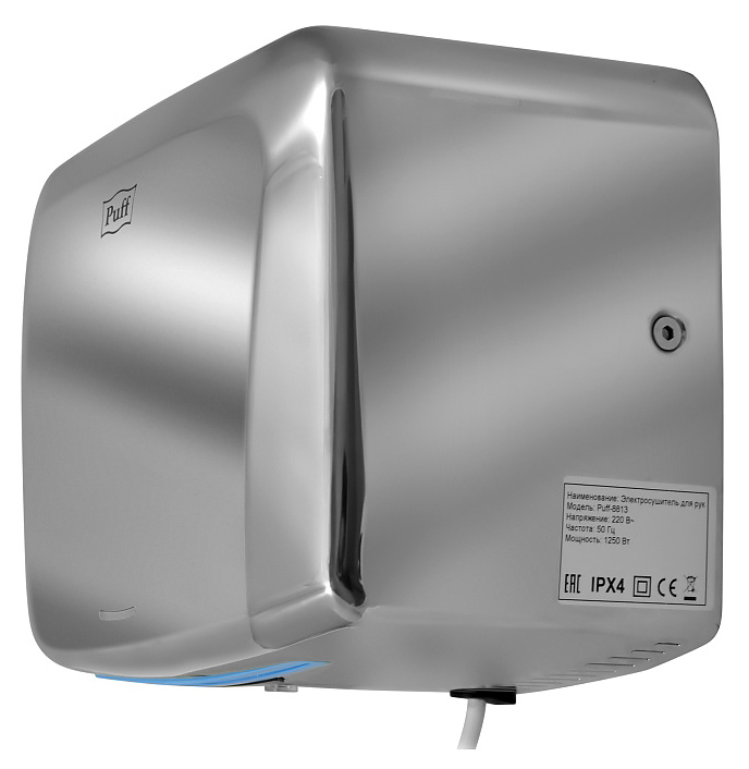 Сушилка для рук Puff 8813 используется в гостиницах, отелях, бассейнах, фитнес-клубах и спа-центрах. Прибор оснащен сенсорным управлением, подсветкой и автоматическим включением и выключением. Корпус выполнен из прочной нержавеющей стали 304, что гарантирует антивандальность. В комплект поставки входят крепеж и крепежная планка. Особенности: