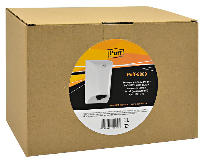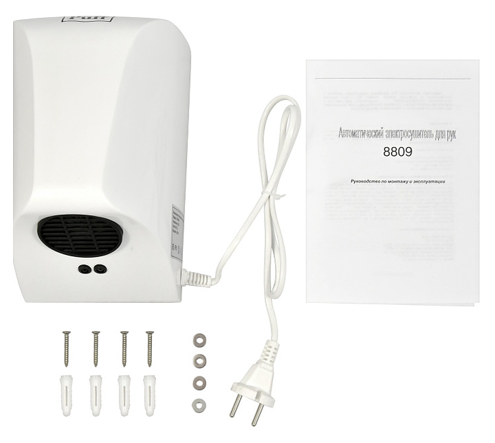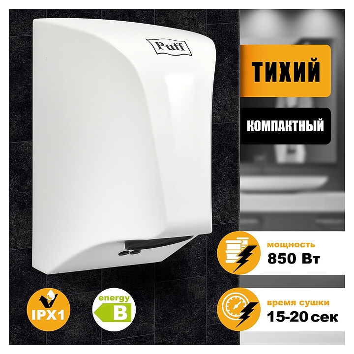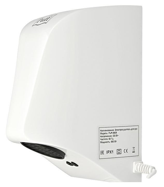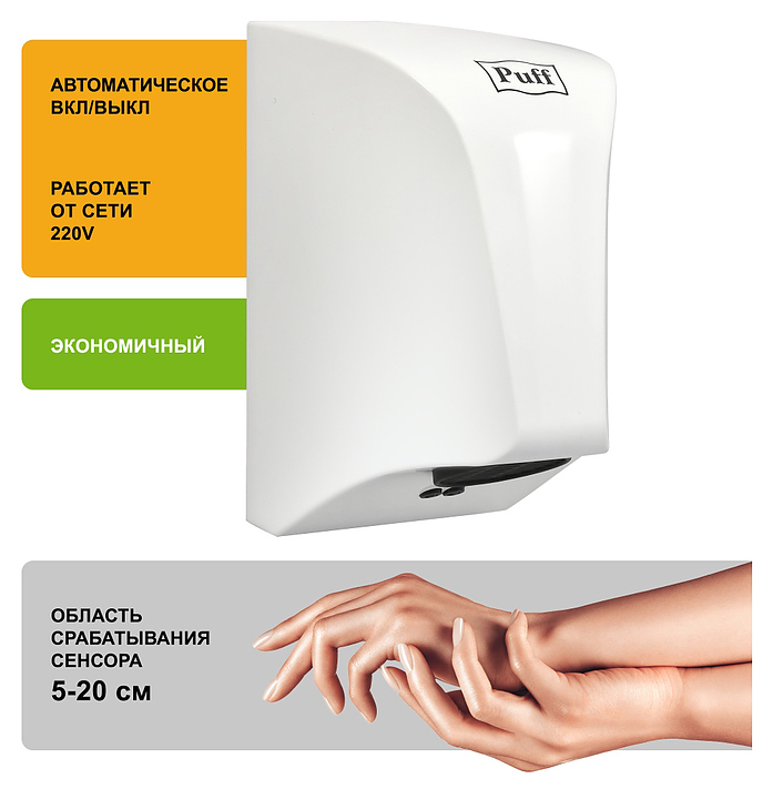 Сушилка для рук Puff 8809 используется в гостиницах, отелях, бассейнах, фитнес-клубах и спа-центрах. Прибор оснащен сенсорным управлением и автоматическим включением и выключением. Корпус выполнен из прочного ABS-пастика. В комплект поставки входит крепеж. Особенности: