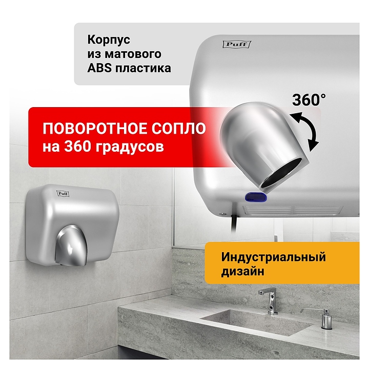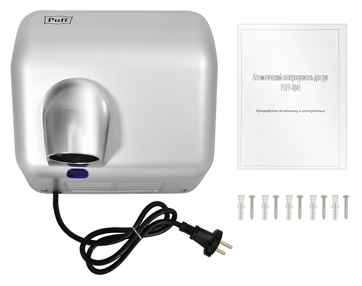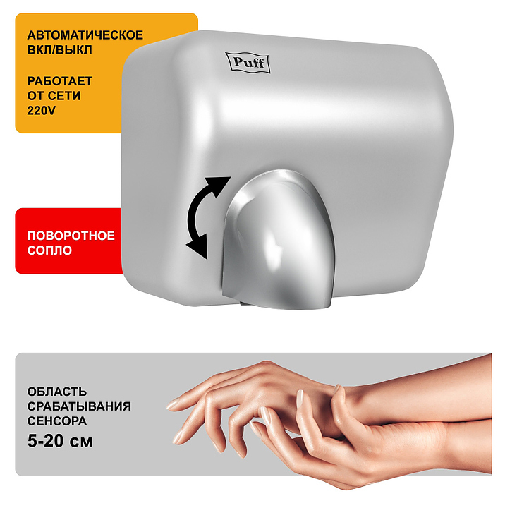 Сушилка для рук Puff 8841 используется в гостиницах, отелях, бассейнах, фитнес-клубах и спа-центрах. Прибор оснащен сенсорным управлением, поворотным соплом и автоматическим включением и выключением. Автоматическое включение срабатывает при поднесении рук на расстояние до 15 см от нижней части корпуса за счет предусмотренного инфракрасного датчика. Для создания необходимой безопасности во время эксплуатации электросушилка снабжена термоконтроллером и предохранителем от перегрева. Корпус выполнен из прочного ABS-пластика. В комплект поставки входит крепеж. Особенности: