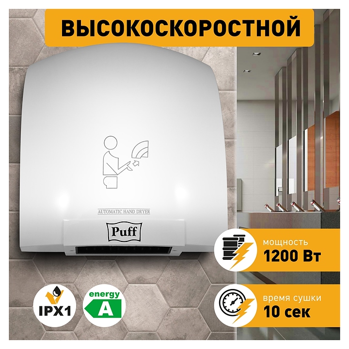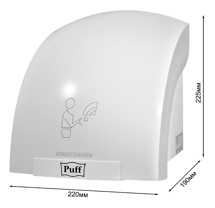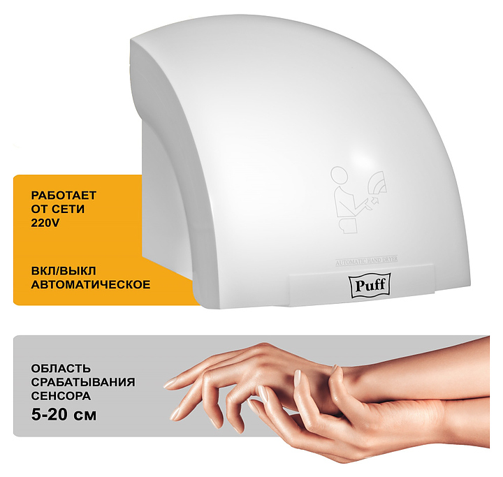 Сушилка для рук Puff 8975 используется в гостиницах, отелях, бассейнах, фитнес-клубах и спа-центрах. Прибор оснащен сенсорным управлением и автоматическим включением и выключением. Корпус выполнен из прочного ABS-пастика. В комплект поставки входят крепежная планка и крепеж. Особенности: