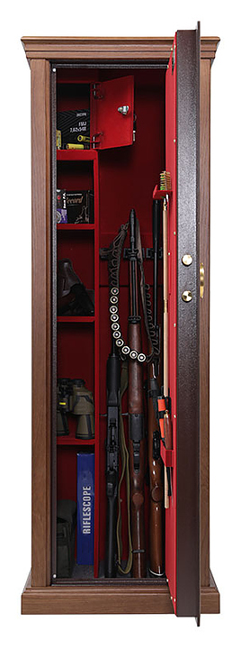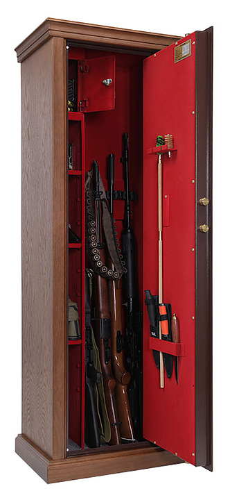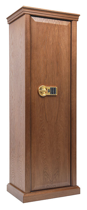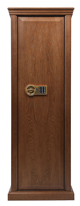 Оружейный сейф Valberg Сафари EL Д предназначен для безопасного хранения длинноствольного огнестрельного оружия, патронов и аксессуаров в гостиницах, отелях, частных домах и квартирах. Модель оснащена распашной дверью и внутренним патронным отделением (трейзером), запирающимся на ключ. Корпус выполнен из натурального дерева и шпона дуба, внутренняя обивка – из бархата, покрытие замка – 24-каратное золото. Особенности: