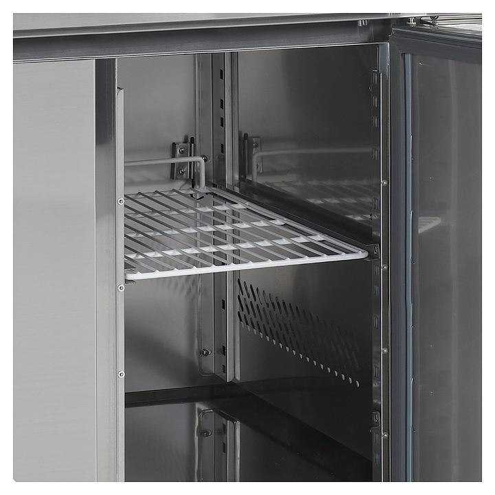 Морозильный стол TEFCOLD GF72 предназначен для раскатки теста и обработки ингредиентов для приготовления блюд, заморозки и хранения продуктов, полуфабрикатов и мороженого на предприятиях общественного питания и торговли. Прибор оснащен съемной столешницей с бортом, 2 распашными самозакрывающимися дверцами, термометром, 2 решатчатыми белыми полками GN1/1 и 4 регулируемыми ножками. Корпус и внутренняя отделка выполнены из нержавеющей стали SS201. Особенности: