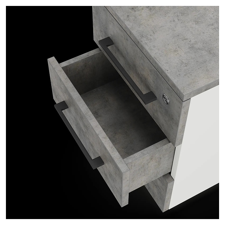 Мобильная тумба Кобор TМ3-40/80 white/chicago используется совместно с офисными столами. Модель оснащена 3 выдвижными ящиками и 4 колесами. Корпус выполнен из ламинированной древесно-стружечной плиты (ЛДСП) цвета белый муар (RAL9016), столешница и ящики – из ЛДСП цвета бетон чикаго (F186 ST9). Дополнительные характеристики: