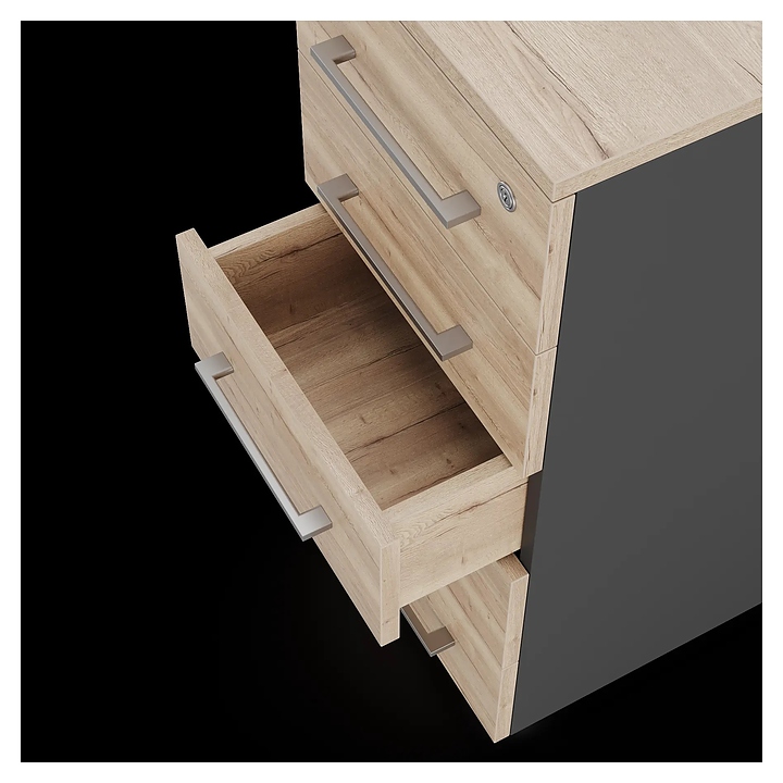 Мобильная тумба Кобор TМ5-40/50 black/natural используется совместно с офисными столами. Модель оснащена 5 выдвижными ящиками и 4 колесами. Корпус выполнен из ламинированной древесно-стружечной плиты (ЛДСП) цвета черный муар (RAL9005), столешница и ящики – из ЛДСП цвета натуральный дуб (H1180 ST37).