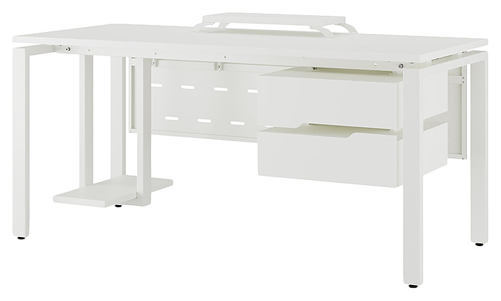 Компьютерный стол Кобор KP-80/80 white/premium используется в офисных помещениях и кабинетах руководителей. Модель оснащена П-образными опорами. Каркас выполнен из металла, выкрашенного в цвет белый муар (RAL9016), столешница – из ламинированной древесно-стружечной плиты (ЛДСП) цвета белый премиум (W1000 ST9). Опции (заказываются отдельно):