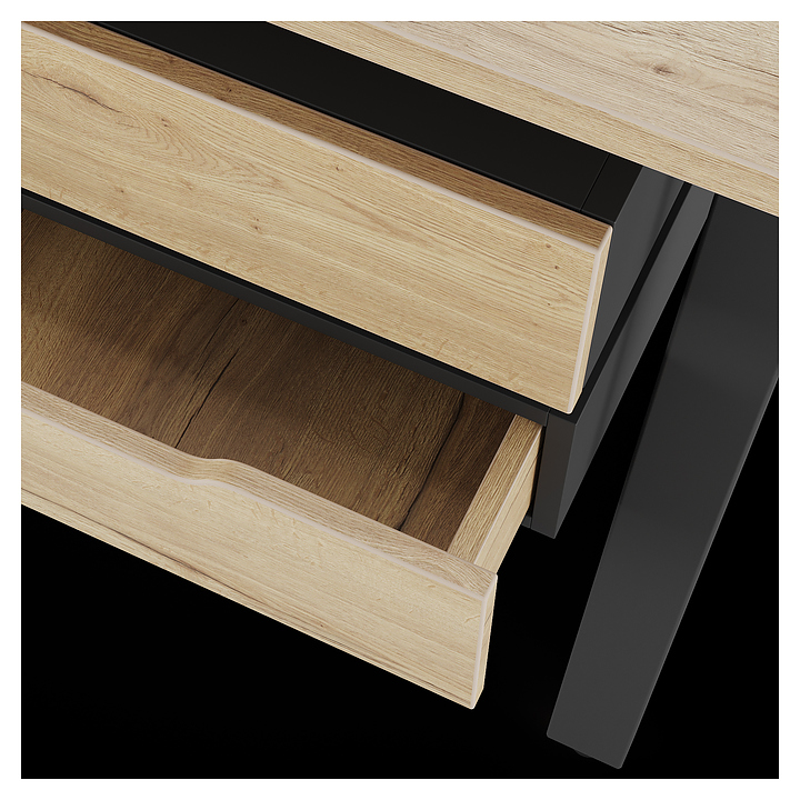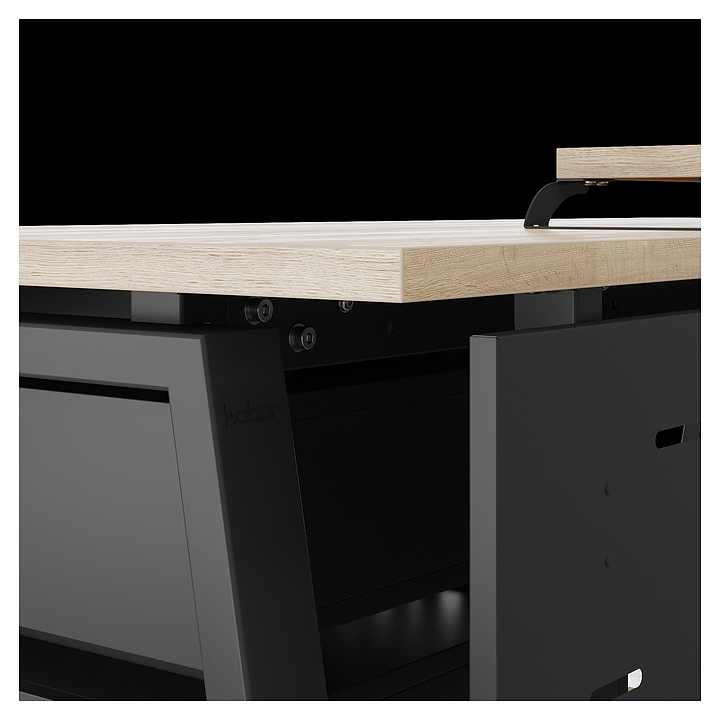 Компьютерный стол Кобор KA-80/80 black/natural используется в офисных помещениях и кабинетах руководителей. Модель оснащена A-образными опорами. Каркас выполнен из металла, выкрашенного в цвет черный муар (RAL9005), столешница – из ламинированной древесно-стружечной плиты (ЛДСП) цвета натуральный дуб (H1180 ST37). Опции (заказываются отдельно):