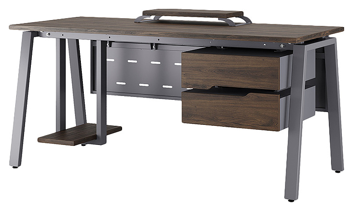 Компьютерный стол Кобор КA-140/60 graphite/charlston используется в офисных помещениях и кабинетах руководителей. Модель оснащена A-образными опорами. Каркас выполнен из металла, выкрашенного в цвет графит муар (RAL7024), столешница – из ламинированной древесно-стружечной плиты (ЛДСП) цвета дуб чарльстон (H3154 ST36). Опции (заказываются отдельно):