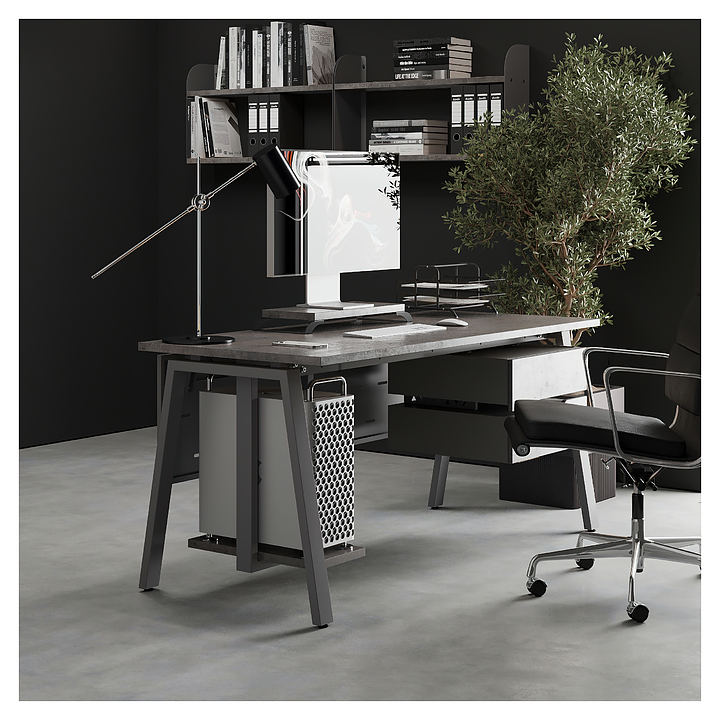 Компьютерный стол Кобор KA-80/60 aluminum/chicago используется в офисных помещениях и кабинетах руководителей. Модель оснащена A-образными опорами. Каркас выполнен из металла, выкрашенного в цвет алюминиевый металлик (RAL9006), столешница – из ламинированной древесно-стружечной плиты (ЛДСП) цвета бетон чикаго (F186 ST9). Опции (заказываются отдельно):