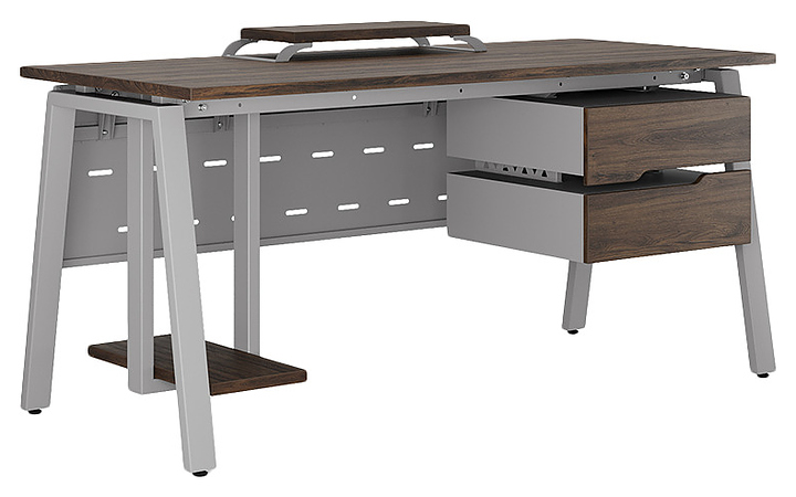 Компьютерный стол Кобор A-100/60 aluminum/charlston используется в офисных помещениях и кабинетах руководителей. Модель оснащена A-образными опорами. Каркас выполнен из металла, выкрашенного в цвет алюминиевый металлик (RAL9006), столешница – из ламинированной древесно-стружечной плиты (ЛДСП) цвета дуб чарльстон (H3154 ST36). Опции (заказываются отдельно):