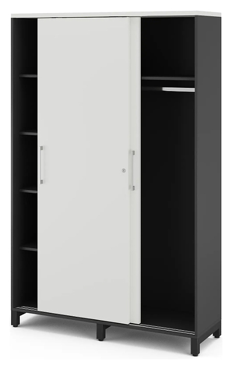 Шкаф для одежды Кобор HKG/5-120/60/M используется в офисных помещениях и кабинетах руководителя. Модель оснащена 2 дверцами-купе с замком, 3 полками в левой секции, 1 общей верхней полкой, штангой для одежды в правой секции и регулируемыми по высоте опорами. Корпус, верхняя крышка и дверцы выполнены из ЛДСП, задняя стенка и ножки - из металла. Дополнительные характеристики: