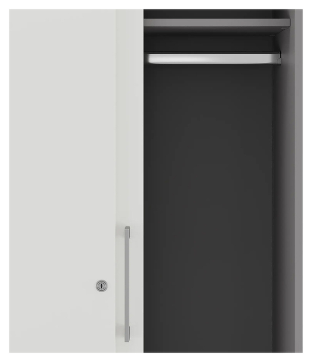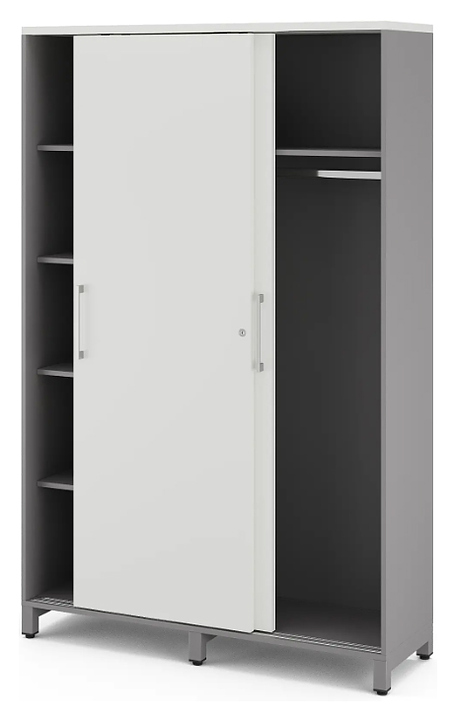 Шкаф для одежды Кобор HKG/5-120/60/M используется в офисных помещениях и кабинетах руководителя. Модель оснащена 2 дверцами-купе с замком, 3 полками в левой секции, 1 общей верхней полкой, штангой для одежды в правой секции и регулируемыми по высоте опорами. Корпус, верхняя крышка и дверцы выполнены из ЛДСП, задняя стенка и ножки - из металла. Дополнительные характеристики: