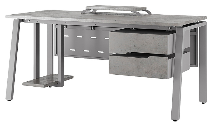Компьютерный стол Кобор КAB-100/60 aluminum/chicago используется в офисных помещениях и кабинетах руководителей. Модель оснащена A-образными опорами со скошенными фронтальными сегментами. Каркас выполнен из металла, выкрашенного в цвет алюминиевый металлик (RAL9006), столешница – из ламинированной древесно-стружечной плиты (ЛДСП) цвета бетон чикаго (F186 ST9). Опции (заказываются отдельно):