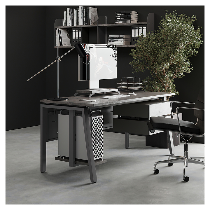 Компьютерный стол Кобор КAB-80/80 aluminum/chicago используется в офисных помещениях и кабинетах руководителей. Модель оснащена A-образными опорами со скошенными фронтальными сегментами. Каркас выполнен из металла, выкрашенного в цвет алюминиевый металлик (RAL9006), столешница – из ламинированной древесно-стружечной плиты (ЛДСП) цвета бетон чикаго (F186 ST9). Опции (заказываются отдельно):