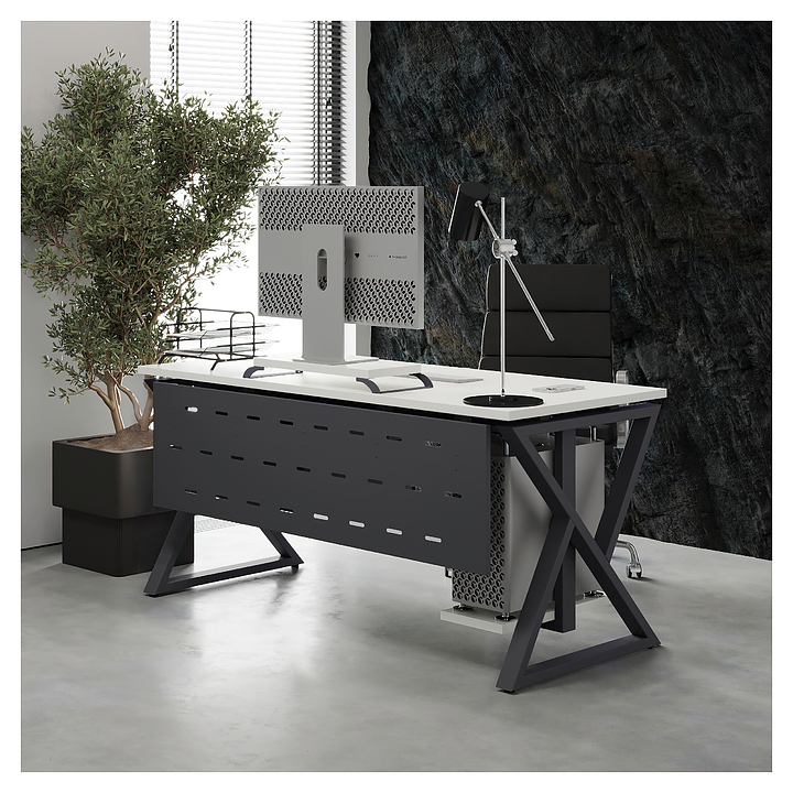 Компьютерный стол Кобор KW-80/60 graphite/premium используется в офисных помещениях и кабинетах руководителей. Модель оснащена W-образными опорами. Каркас выполнен из металла, выкрашенного в цвет графит муар (RAL7024), столешница – из ламинированной древесно-стружечной плиты (ЛДСП) цвета белый премиум (W1000 ST9). Опции (заказываются отдельно):