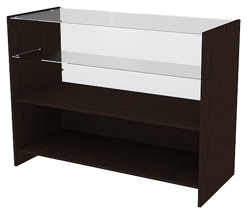 Витрина Пищевые Технологии ПБСС предназначена для предпродажной демонстрации не требующих охлаждения пищевых продуктов, а также различных не продовольственных товаров на предприятиях общественного питания и торговли. Модель оснащена глухими боковинами, закрытой со стороны покупателя нишей для хранения инвентаря или запаса товара, верхней секцией с внутренней полкой и прозрачным остеклением. Боковины и панели ниши выполнены из ламинированной древесно-стружечной плиты (ЛДСП) цвета дуб венге с кромкой из поливинилхлорида (ПВХ), полка в верхней секции – из стекла. Дополнительные характеристики: