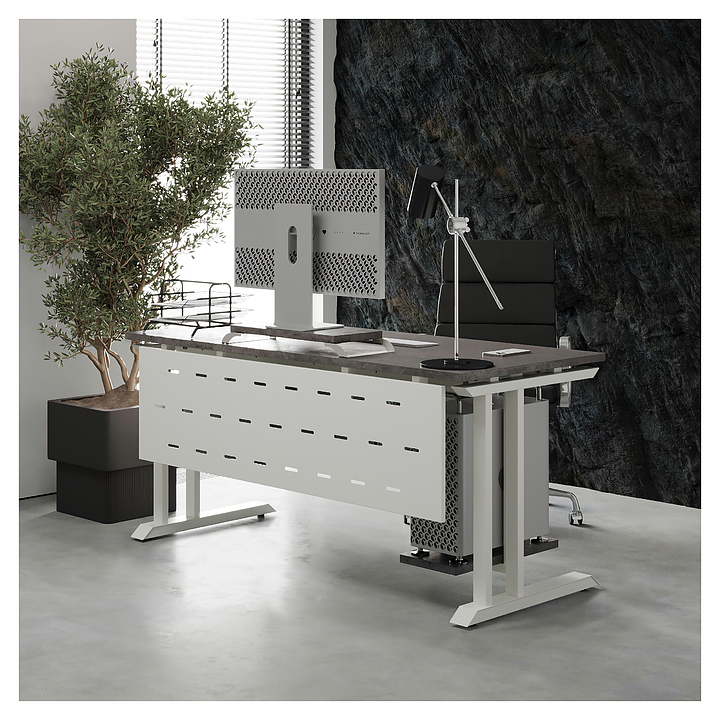 Компьютерный стол Кобор KL1-80/60 white/chicago используется в офисных помещениях и кабинетах руководителей. Модель оснащена L-образными опорами. Каркас выполнен из металла, выкрашенного в цвет белый муар (RAL9016), столешница – из ламинированной древесно-стружечной плиты (ЛДСП) цвета бетон чикаго (F186 ST9). Опции (заказываются отдельно):