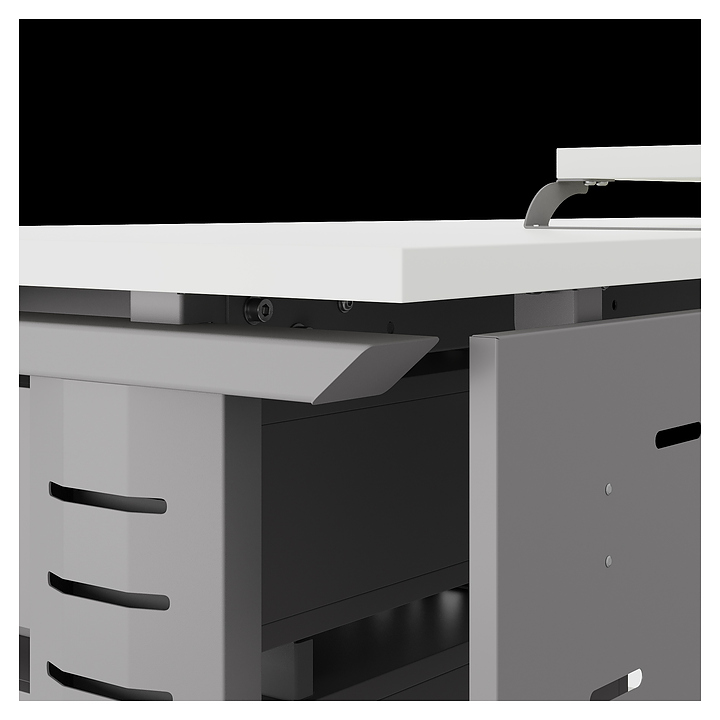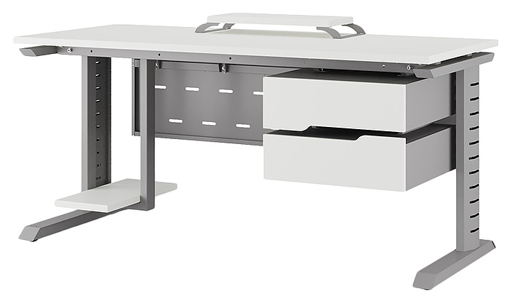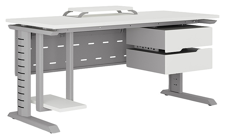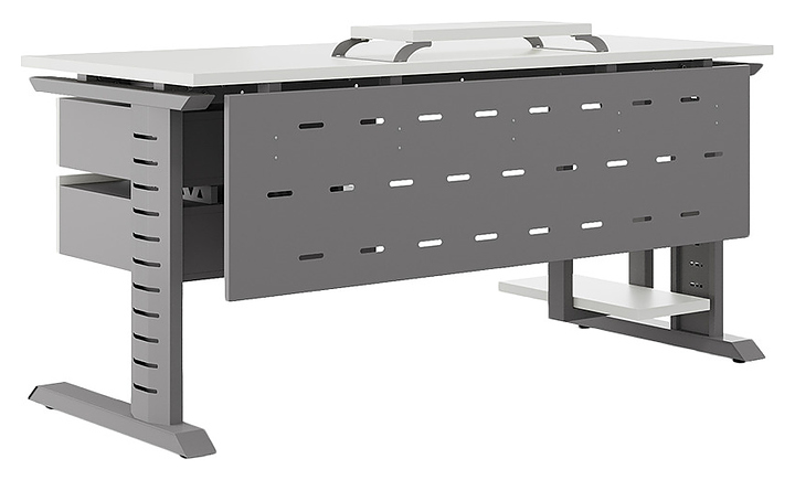 Компьютерный стол Кобор КL2-80/60 aluminum/premium используется в офисных помещениях и кабинетах руководителей. Модель оснащена L-образными опорами с декоративными вставками на боковинах. Каркас выполнен из металла, выкрашенного в цвет алюминиевый металлик (RAL9006), столешница – из ламинированной древесно-стружечной плиты (ЛДСП) цвета белый премиум (W1000 ST9). Опции (заказываются отдельно):