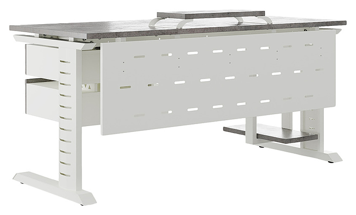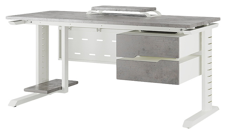 Компьютерный стол Кобор KL2-80/60 white/chicago используется в офисных помещениях и кабинетах руководителей. Модель оснащена L-образными опорами с декоративными вставками на боковинах. Каркас выполнен из металла, выкрашенного в цвет белый муар (RAL9016), столешница – из ламинированной древесно-стружечной плиты (ЛДСП) цвета бетон чикаго (F186 ST9). Опции (заказываются отдельно):