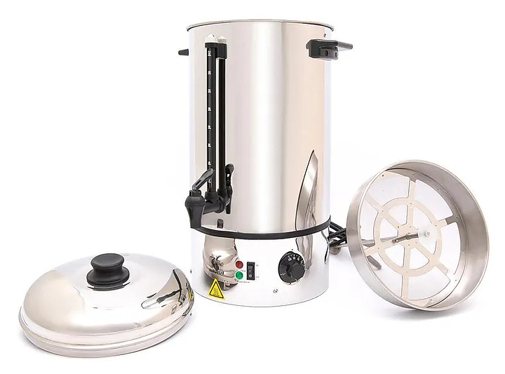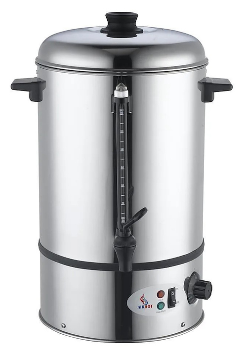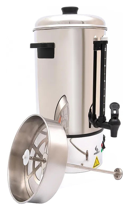 Кофеварка-перколятор Airhot CP15 используется на предприятиях общественного питания и торговли, в офисах и отелях для быстрого нагрева воды и поддержания заданной температуры, приготовления чая и кофе. Модель оснащена закрытым тэном, аварийным термостатом, световыми индикаторами «Нагрев» и «Поддержание тепла», регулятором температуры. Корпус термопота выполнен из нержавеющей стали. В комплект поставки входит перколяторная трубка для кипятка и фильтр для кофе. Особенности: