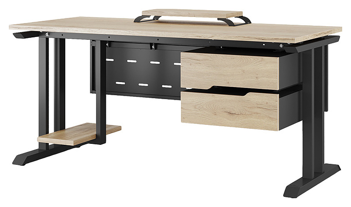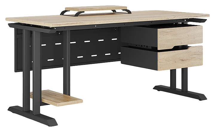 Компьютерный стол Кобор КT-80/60 black/natural используется в офисных помещениях и кабинетах руководителей. Модель оснащена T-образными опорами. Каркас выполнен из металла, выкрашенного в цвет черный муар (RAL9005), столешница – из ламинированной древесно-стружечной плиты (ЛДСП) цвета натуральный дуб (H1180 ST37). Опции (заказываются отдельно):