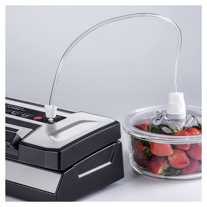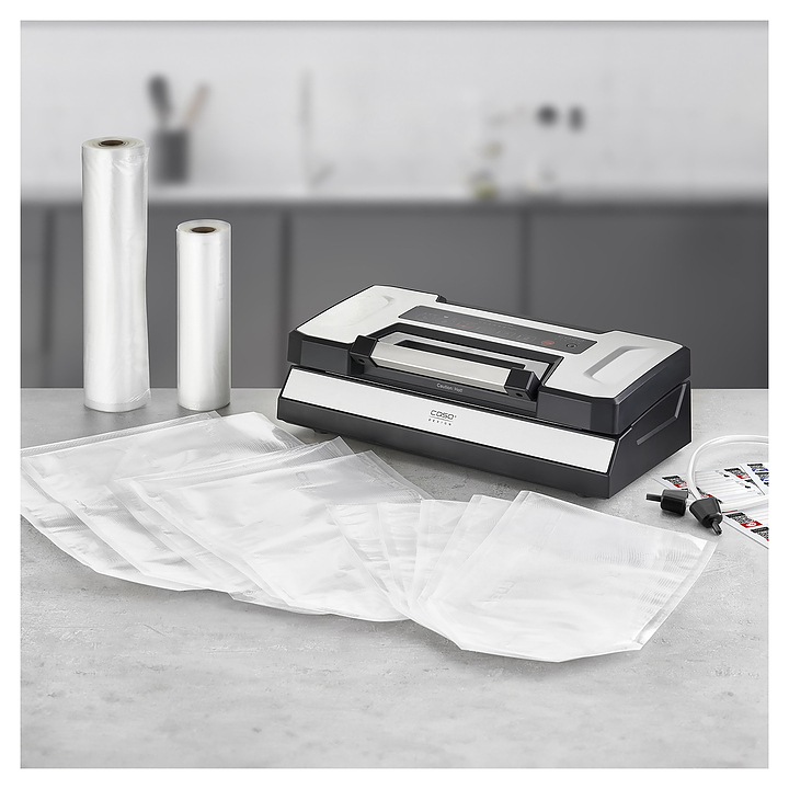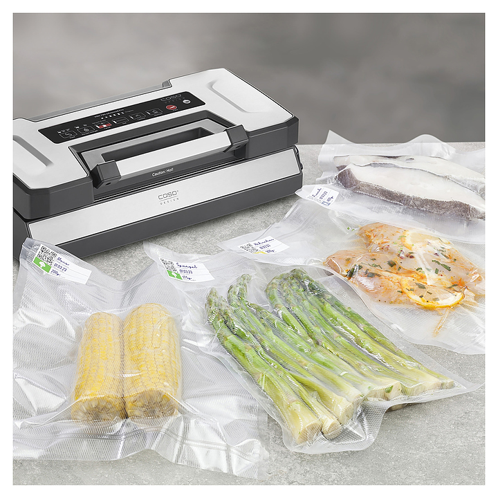 Вакуумный упаковщик CASO VRH 790 используется в частных домах, квартирах, отелях и офисах для упаковки в вакуум мяса, рыбы, овощей, фруктов и домашних заготовок в пакетах или контейнерах для увеличения срока хранения. Модель оснащена сенсорной панелью управления с белым светодиодным дисплеем и индикатором выполнения и съемным поддоном для сбора влаги. Корпус выполнен из высококачественной нержавеющей стали с покрытием против отпечатков пальцев и ручкой из нержавеющей стали. В комплект поставки входят: