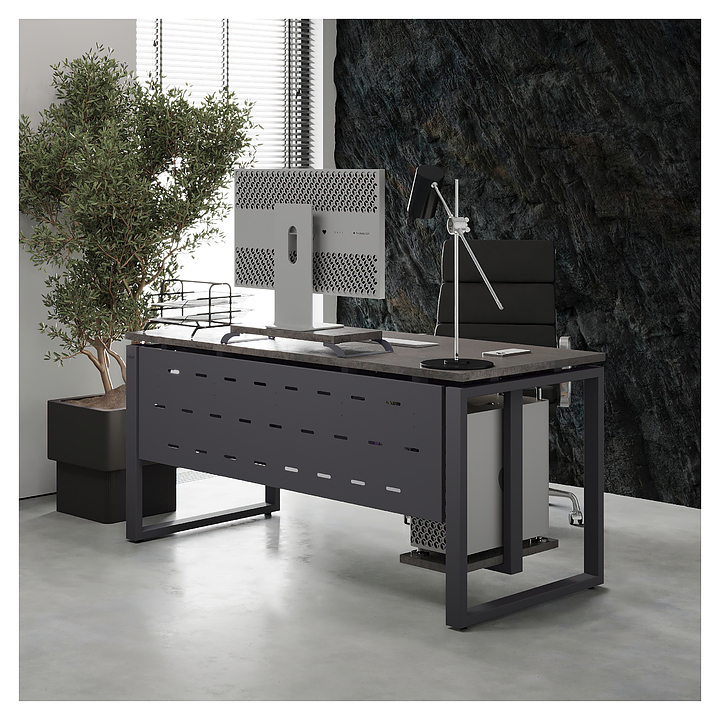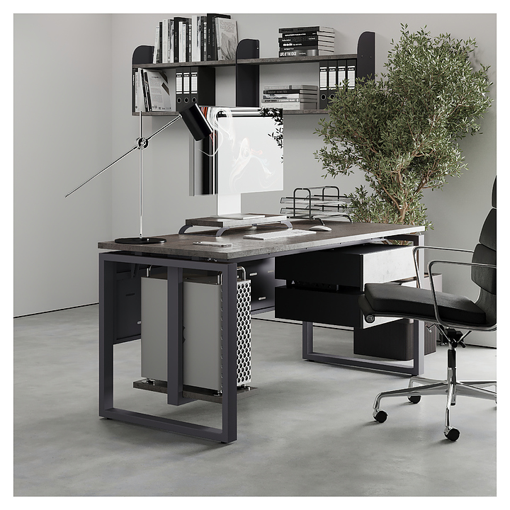 Компьютерный стол Кобор KO1-80/60 graphite/chicago используется в офисных помещениях и кабинетах руководителей. Модель оснащена O-образными опорами. Каркас выполнен из металла, выкрашенного в цвет графит муар (RAL7024), столешница – из ламинированной древесно-стружечной плиты (ЛДСП) цвета бетон чикаго (F186 ST9). Опции (заказываются отдельно):