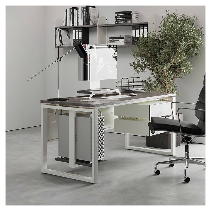Компьютерный стол Кобор КO1-80/60 white/chicago используется в офисных помещениях и кабинетах руководителей. Модель оснащена O-образными опорами. Каркас выполнен из металла, выкрашенного в цвет белый муар (RAL9016), столешница – из ламинированной древесно-стружечной плиты (ЛДСП) цвета бетон чикаго (F186 ST9). Опции (заказываются отдельно):