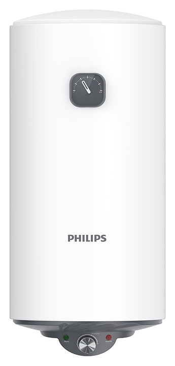 Электрический накопительный водонагреватель Philips AWH1600/51(30DA) серии UltraHeat Round используется в местных системах водоснабжения для постоянного автономного обеспечения горячей водой одной или нескольких точек водоразбора таких как санитарные узлы, кухни в жилых и загородных частных домах, а также других бытовых и хозяйственных объектах. Модель оснащена внутренним баком, трубчатым электронагревателем (ТЭНом), расположенной на нижней крышке электромеханической панелью управления, резьбовыми штуцерами для подвода холодной и выхода горячей воды. Вертикально ориентированный корпус цилиндрической формы выполнен из металла с матовым антикоррозийным покрытием белого цвета, нижняя крышка – из ударопрочного пластика серого цвета, внутненний бак – из стали, ТЭН – из литого алюминия, термоизоляция – из пенополиуретана высокой плотности. В комплект поставки входят 2 монтажных кронштейна, 2 анкерных болта, заводская упаковка, инструкция по эксплуатации и гарантийный талон. Особенности: