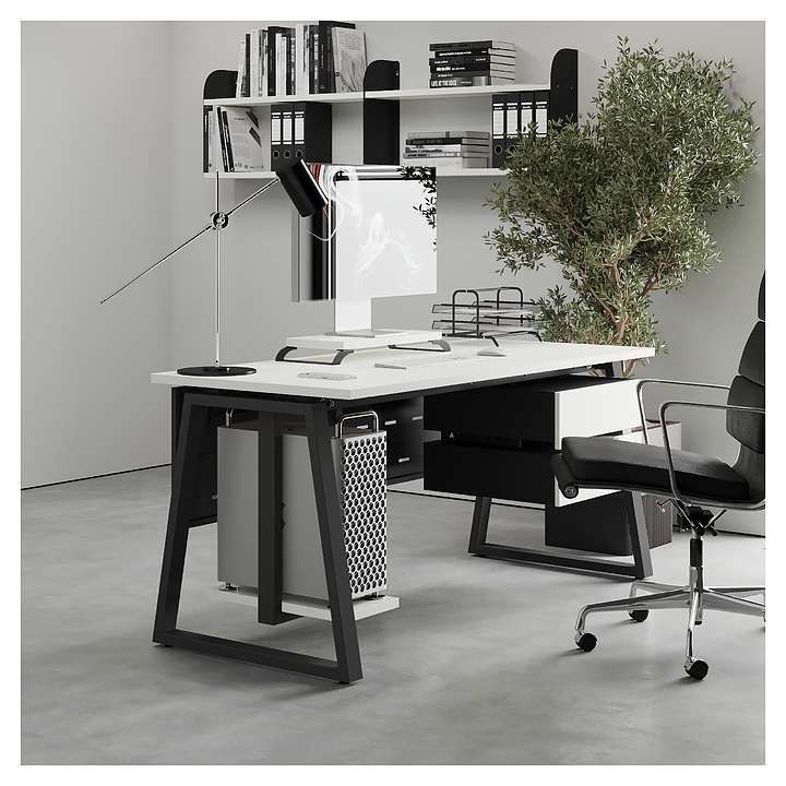 Компьютерный стол Кобор КTR-80/60 black/premium используется в офисных помещениях и кабинетах руководителей. Модель оснащена опорами в форме трапеции. Каркас выполнен из металла, выкрашенного в цвет черный муар (RAL9005), столешница – из ламинированной древесно-стружечной плиты (ЛДСП) цвета белый премиум (W1000 S9). Опции (заказываются отдельно):