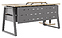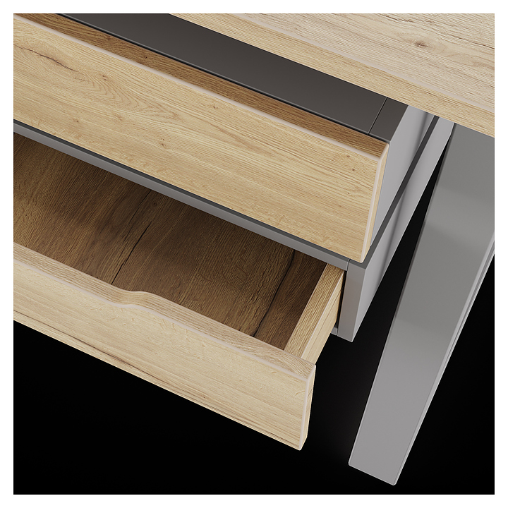 Компьютерный стол Кобор KTR-80/60 aluminum/natural используется в офисных помещениях и кабинетах руководителей. Модель оснащена опорами в форме трапеции. Каркас выполнен из металла, выкрашенного в цвет алюминиевый металлик (RAL9006), столешница – из ламинированной древесно-стружечной плиты (ЛДСП) цвета натуральный дуб (H1180 ST37). Опции (заказываются отдельно):