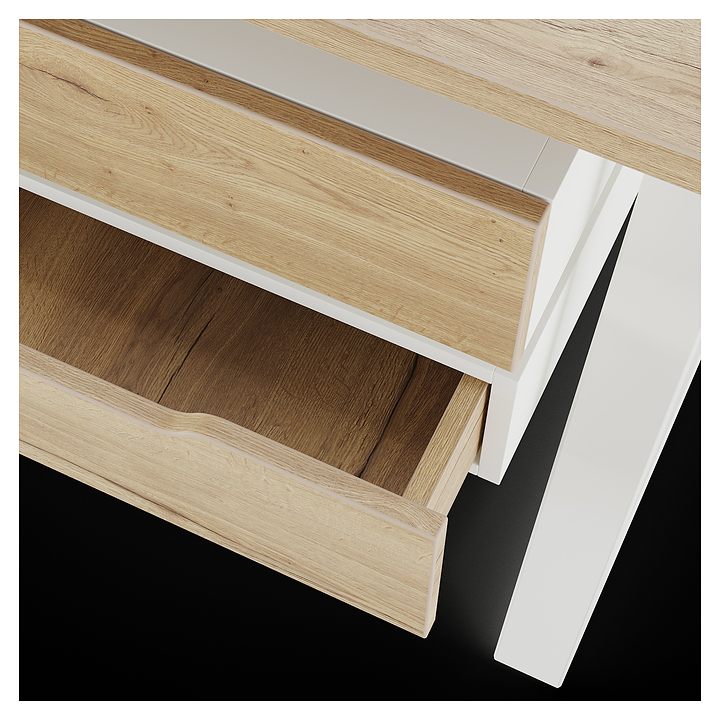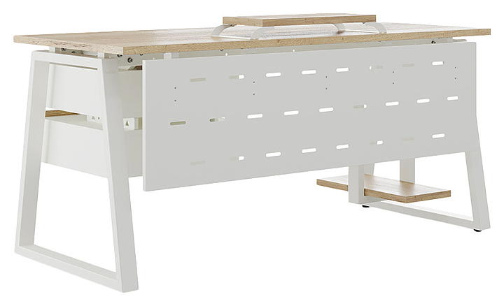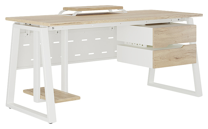 Компьютерный стол Кобор КTR-80/60 white/natural используется в офисных помещениях и кабинетах руководителей. Модель оснащена опорами в форме трапеции. Каркас выполнен из металла, выкрашенного в цвет белый муар (RAL9016), столешница – из ламинированной древесно-стружечной плиты (ЛДСП) цвета натуральный дуб (H1180 ST37). Опции (заказываются отдельно):