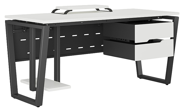 Компьютерный стол Кобор KOTR-80/60 black/premium используется в офисных помещениях и кабинетах руководителей. Модель оснащена опорами в форме обратной трапеции. Каркас выполнен из металла, выкрашенного в цвет черный муар (RAL9005), столешница – из ламинированной древесно-стружечной плиты (ЛДСП) цвета белый премиум (W1000 S9). Опции (заказываются отдельно):