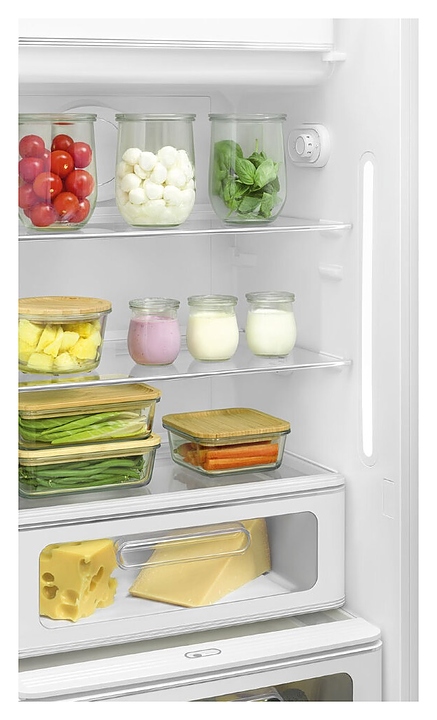 Холодильник SMEG FAB28LRD5 предназначен для охлаждения, заморозки, кратковременного и длительного хранения пищевых продуктов и напитков в гостиничных номерах, офисах, бытовых условиях и подсобных помещениях. Модель оснащена холодильной камерой с интегрированной в нее сверху морозильной камерой с распашной дверцей, цокольной решеткой, левосторонней распашной дверью с фиксированной горизонтальной рукояткой и накладными литерами логотипа в верхней части фронта, кабелем питания с евровилкой и расположенной в холодильной камере электомеханической панелью управления. Дверь выпуклой обтекаемой формы выполнена из термоформируемого полимера с глянцевой поверхностью красного цвета, боковины – из стали с антикоррозийным покрытием под цвет фронта, рукоятка и литеры логотипа с хромированным покрытием, внутренняя облицовка – из белого полимера, плоские полки – из безопасного закаленного стекла, ящики и навесные полки – из прочного прозрачного полимера, окантовка полок – из металлического профиля с хромированной поверхностью. Комплектация:
