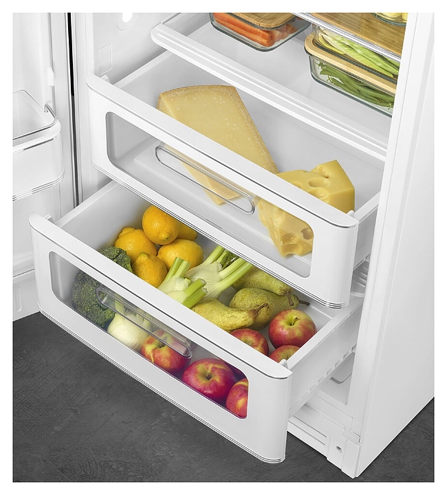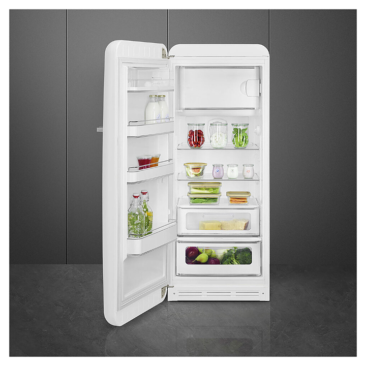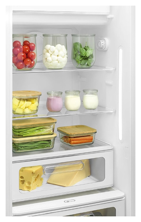 Холодильник SMEG FAB28LWH5 предназначен для охлаждения, заморозки, кратковременного и длительного хранения пищевых продуктов и напитков в гостиничных номерах, офисах, бытовых условиях и подсобных помещениях. Модель оснащена холодильной камерой с интегрированной в нее сверху морозильной камерой с распашной дверцей, цокольной решеткой, левосторонней распашной дверью с фиксированной горизонтальной рукояткой и накладными литерами логотипа в верхней части фронта, кабелем питания с евровилкой и расположенной в холодильной камере электомеханической панелью управления. Дверь выпуклой обтекаемой формы выполнена из термоформируемого полимера с глянцевой поверхностью белого цвета, боковины – из стали с антикоррозийным покрытием под цвет фронта, рукоятка и литеры логотипа с хромированным покрытием, внутренняя облицовка – из белого полимера, плоские полки – из безопасного закаленного стекла, ящики и навесные полки – из прочного прозрачного полимера, окантовка полок – из металлического профиля с хромированной поверхностью. Комплектация: