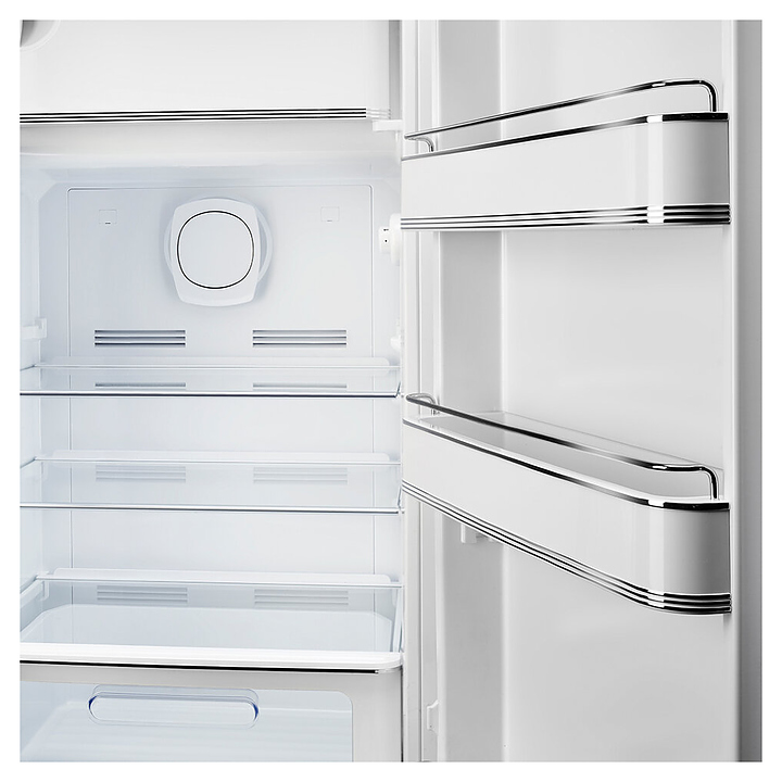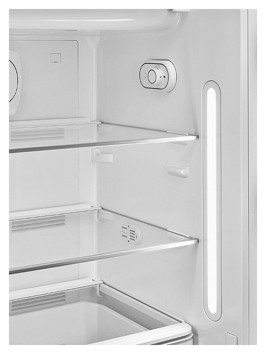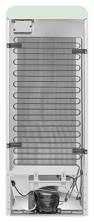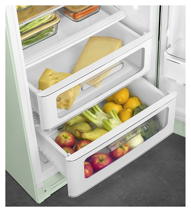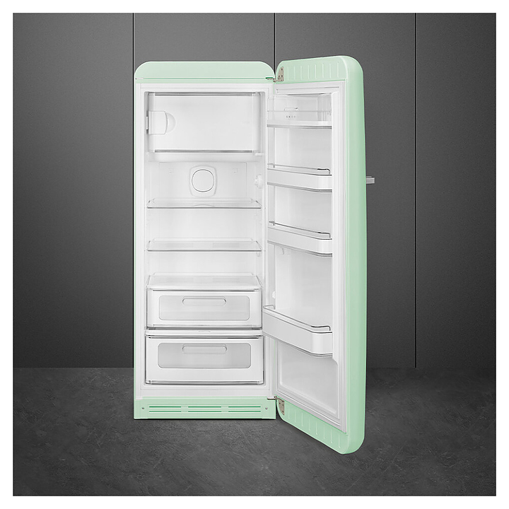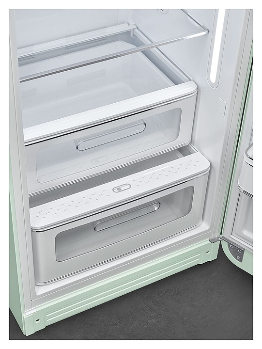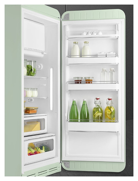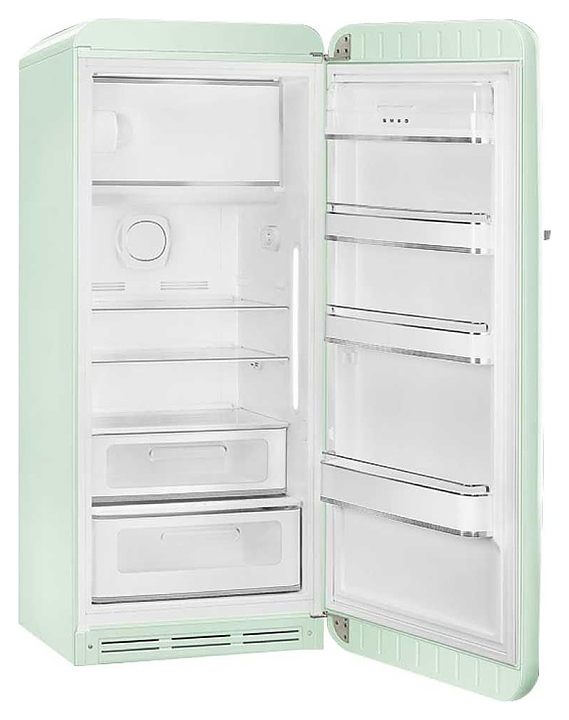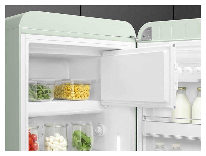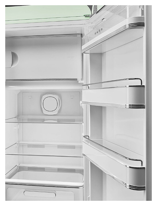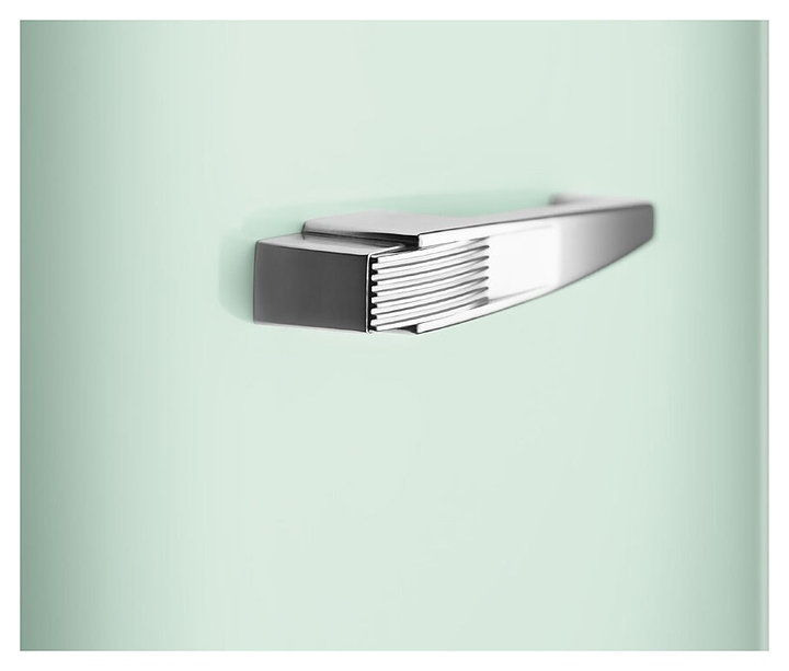 Холодильник SMEG FAB28RPG5 предназначен для охлаждения, заморозки, кратковременного и длительного хранения пищевых продуктов и напитков в гостиничных номерах, офисах, бытовых условиях и подсобных помещениях. Модель оснащена холодильной камерой с интегрированной в нее сверху морозильной камерой с распашной дверцей, цокольной решеткой, правосторонней распашной дверью с фиксированной горизонтальной рукояткой и накладными литерами логотипа в верхней части фронта, кабелем питания с евровилкой и расположенной в холодильной камере электомеханической панелью управления. Дверь выпуклой обтекаемой формы выполнена из термоформируемого полимера с глянцевой поверхностью пастельного зеленого оттенка, боковины – из стали с антикоррозийным покрытием под цвет фронта, рукоятка и литеры логотипа с хромированным покрытием, внутренняя облицовка – из белого полимера, плоские полки – из безопасного закаленного стекла, ящики и навесные полки – из прочного прозрачного полимера, окантовка полок – из металлического профиля с хромированной поверхностью. Комплектация: