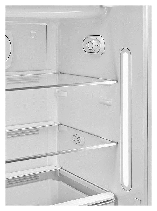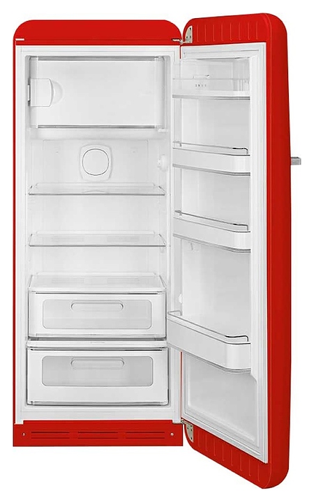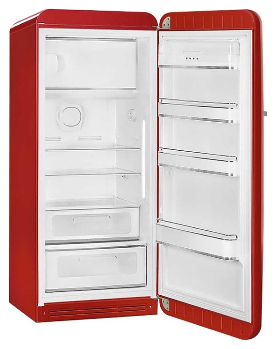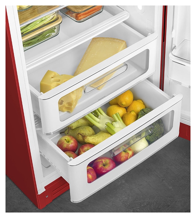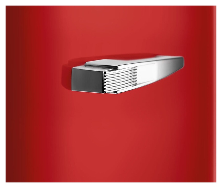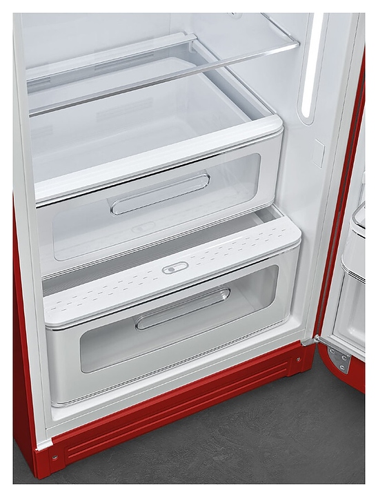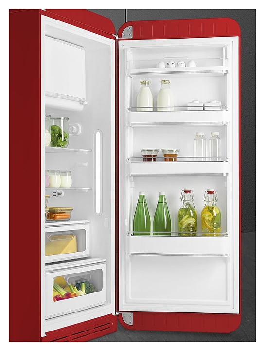 Холодильник SMEG FAB28RRD5 предназначен для охлаждения, заморозки, кратковременного и длительного хранения пищевых продуктов и напитков в гостиничных номерах, офисах, бытовых условиях и подсобных помещениях. Модель оснащена холодильной камерой с интегрированной в нее сверху морозильной камерой с распашной дверцей, цокольной решеткой, правосторонней распашной дверью с фиксированной горизонтальной рукояткой и накладными литерами логотипа в верхней части фронта, кабелем питания с евровилкой и расположенной в холодильной камере электомеханической панелью управления. Дверь выпуклой обтекаемой формы выполнена из термоформируемого полимера с глянцевой поверхностью красного цвета, боковины – из стали с антикоррозийным покрытием под цвет фронта, рукоятка и литеры логотипа с хромированным покрытием, внутренняя облицовка – из белого полимера, плоские полки – из безопасного закаленного стекла, ящики и навесные полки – из прочного прозрачного полимера, окантовка полок – из металлического профиля с хромированной поверхностью. Комплектация: