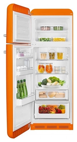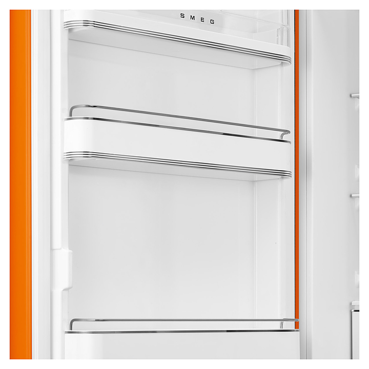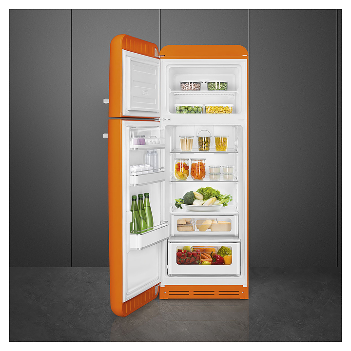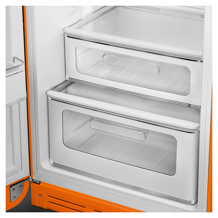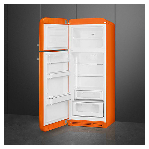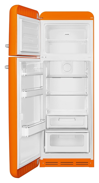 Холодильник SMEG FAB30LOR5 предназначен для охлаждения, заморозки, кратковременного и длительного хранения пищевых продуктов и напитков в гостиничных номерах, офисах, бытовых условиях и подсобных помещениях. Модель оснащена холодильной и морозильной камерами с левосторонними распашными дверьми, фиксированными горизонтальными рукоятками, цокольной решеткой, кабелем питания с евровилкой и расположенной в холодильной камере электомеханической панелью управления. Дверь выпуклой обтекаемой формы выполнена из термоформируемого полимера с глянцевой поверхностью оранжевого цвета, боковины – из стали с антикоррозийным покрытием под цвет фронта, рукоятки и накладные литеры логотипа в верхней части фронта с хромированным покрытием, внутренняя облицовка – из белого полимера, плоские полки – из безопасного закаленного стекла, ящики и навесные полки – из прочного прозрачного полимера, окантовка полок – из металлического профиля с хромированной поверхностью. Комплектация: