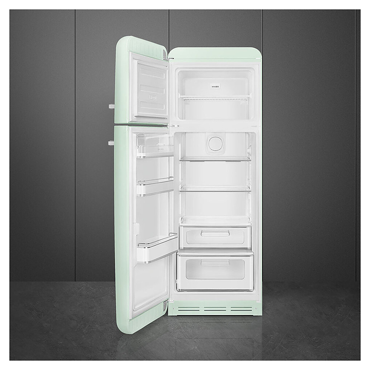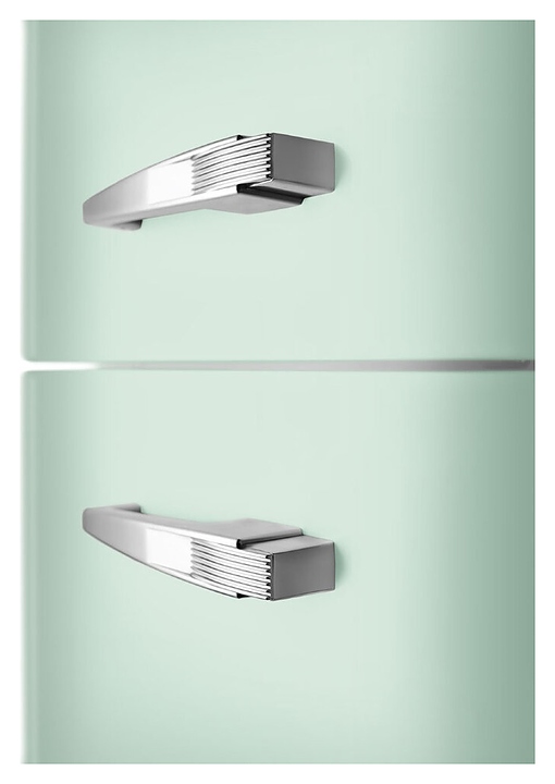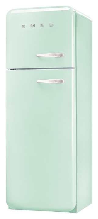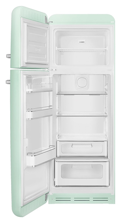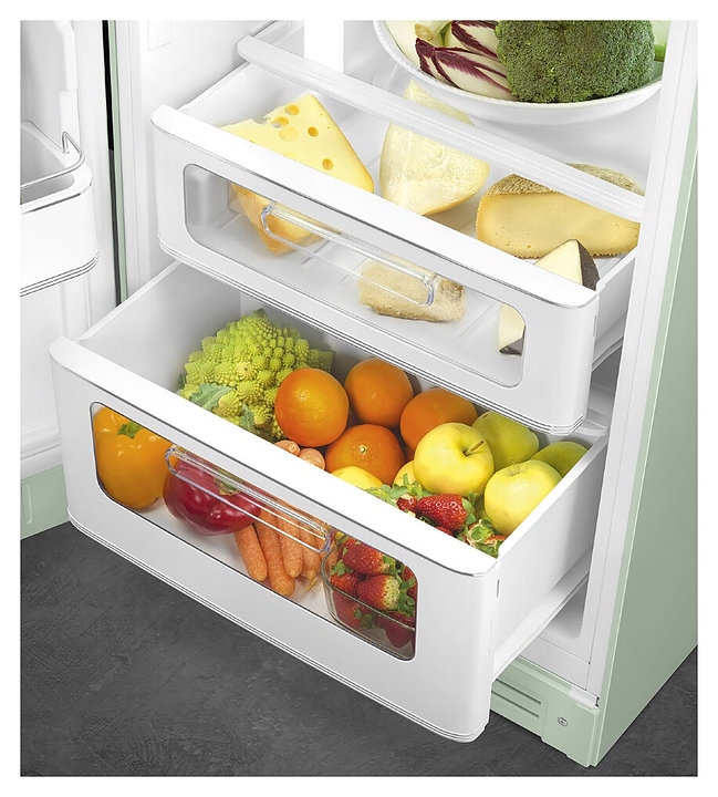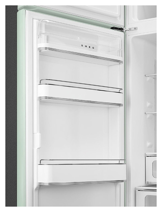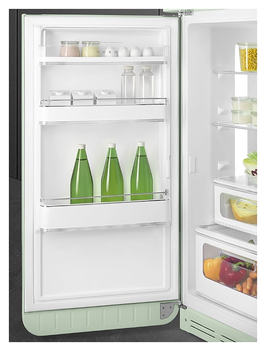 Холодильник SMEG FAB30LPG5 предназначен для охлаждения, заморозки, кратковременного и длительного хранения пищевых продуктов и напитков в гостиничных номерах, офисах, бытовых условиях и подсобных помещениях. Модель оснащена холодильной и морозильной камерами с левосторонними распашными дверьми, фиксированными горизонтальными рукоятками, цокольной решеткой, кабелем питания с евровилкой и расположенной в холодильной камере электомеханической панелью управления. Дверь выпуклой обтекаемой формы выполнена из термоформируемого полимера с глянцевой поверхностью пастельного зеленого оттенка, боковины – из стали с антикоррозийным покрытием под цвет фронта, рукоятки и накладные литеры логотипа в верхней части фронта с хромированным покрытием, внутренняя облицовка – из белого полимера, плоские полки – из безопасного закаленного стекла, ящики и навесные полки – из прочного прозрачного полимера, окантовка полок – из металлического профиля с хромированной поверхностью. Комплектация: