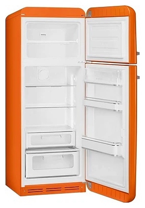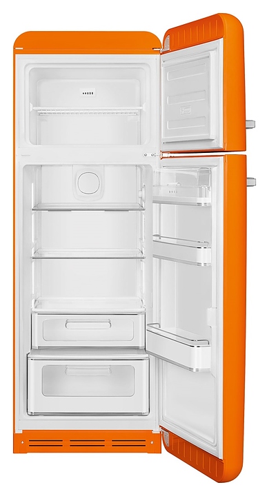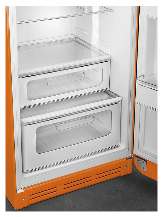 Холодильник SMEG FAB30ROR5 предназначен для охлаждения, заморозки, кратковременного и длительного хранения пищевых продуктов и напитков в гостиничных номерах, офисах, бытовых условиях и подсобных помещениях. Модель оснащена холодильной и морозильной камерами с правосторонними распашными дверьми, фиксированными горизонтальными рукоятками, цокольной решеткой, кабелем питания с евровилкой и расположенной в холодильной камере электомеханической панелью управления. Дверь выпуклой обтекаемой формы выполнена из термоформируемого полимера с глянцевой поверхностью оранжевого цвета, боковины – из стали с антикоррозийным покрытием под цвет фронта, рукоятки и накладные литеры логотипа в верхней части фронта с хромированным покрытием, внутренняя облицовка – из белого полимера, плоские полки – из безопасного закаленного стекла, ящики и навесные полки – из прочного прозрачного полимера, окантовка полок – из металлического профиля с хромированной поверхностью. Комплектация: