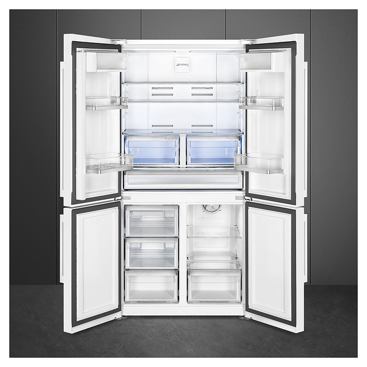 Холодильник SMEG FQ60BDE типа Side-by-Syde предназначен для охлаждения, заморозки, кратковременного и длительного хранения пищевых продуктов и напитков в гостиницах, офисах и домашних условиях. Модель оснащена холодильной и 2 морозильными камерами, 4 распашными дверьми с длинными вертикальными рукоятками, кабелем питания с евровилкой, расположенной на фронте верхней левой двери сенсорной панелью управления с функциональными клавишами и светодиодным дисплеем. Корпус выполнен из стали с антикоррозийным покрытием белого цвета, облицовка интерьера – из белого пластика, плоские полки – из безопасного закаленного стекла, ящики и навесные полки – из прочного прозрачного полимера, рукоятки – из металла с серебристой поверхностью, окантовка полок и ящиков – из металлического профиля с сатинированной серебристой поверхностью.