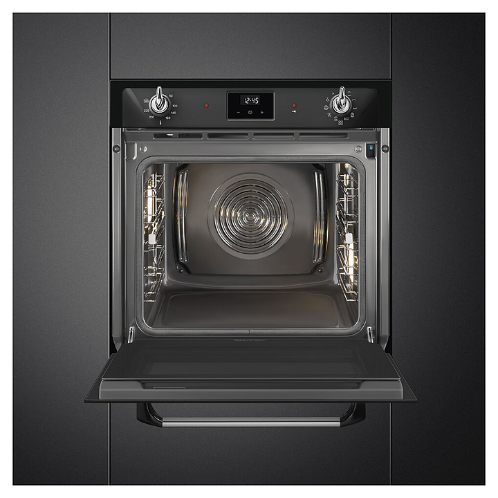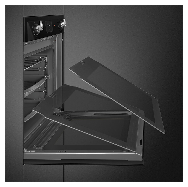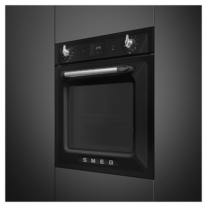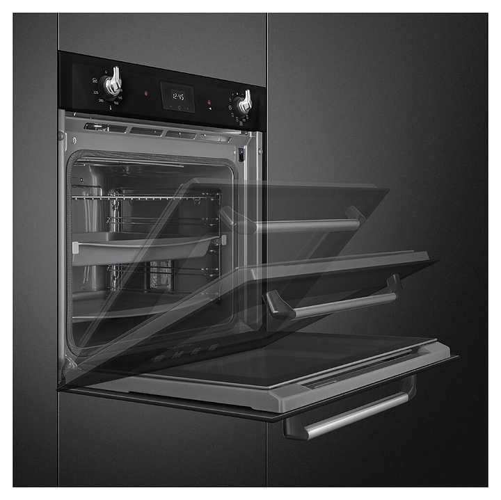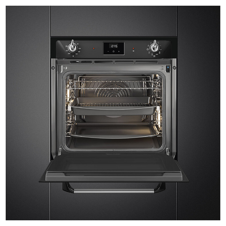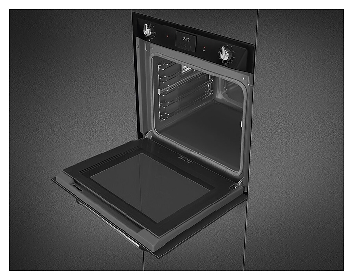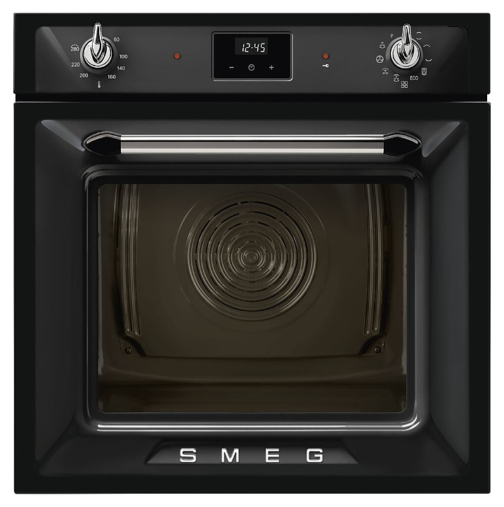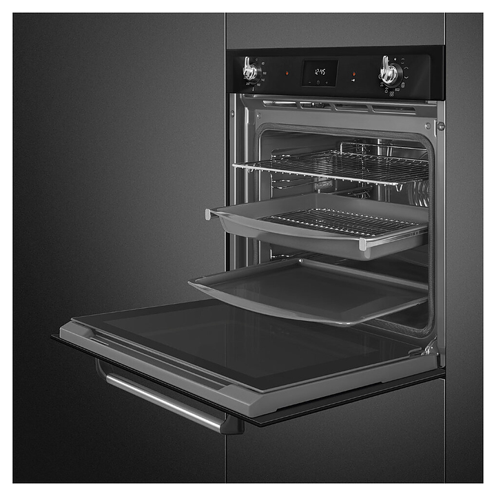 Электрический духовой шкаф SMEG SOP6900TN предназначен для приготовления большого ассортимента блюд в домашних условиях. Модель оснащена рабочей камерой GALILEO с верхним и нижним нагревательными элементамии, грилем, расположенными в задней стенке кольцевым нагревателем и вентилятором, 2 съемными стойками с 5 уровнями направляющих для противней, откидной дверью со смотровым окном и длинной горизонтальной рукояткой, панелью управления с 2 поворотными регуляторами, сенсорной клавиатурой и светодиодным дисплеем (Digiscreen). Корпус выполнен из высококачественной стали, фронт с антикоррозийным эмалированным покрытием черного цвета, фактурными выпуклостями и прозрачным остеклением двери, фурнитура – из металла с сатинированной поверхностью, рукоятка с черными ромбовидными наконечниками, направляющие с хромированным покрытием, глубокий противень – из эмалированного металла.