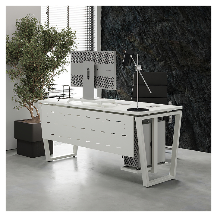 Компьютерный стол Кобор KOTR-80/60 white/premium используется в офисных помещениях и кабинетах руководителей. Модель оснащена опорами в форме обратной трапеции. Каркас выполнен из металла, выкрашенного в цвет белый муар (RAL9016), столешница – из ламинированной древесно-стружечной плиты (ЛДСП) цвета белый премиум (W1000 ST9). Опции (заказываются отдельно):