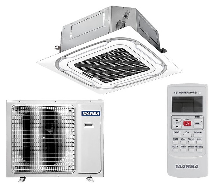 Кассетная сплит-система MARSA MRK-36UHA2N / MRK-36HA2NE-W серии OPTIMAL используется для создания максимально кофмортных условий микроклимата в административных, коммерческих и производственных помещениях. Модель состоит из наружного блока MRK-36HA2NE-W, внутреннего блока кассетного типа MRK-36UHA2N и декоративной лицевой панели UA-MB4L2. Наружный блок оснащен 3-лопастным вентилятором с защитной решеткой, внутренний блок – электронным блоком управления, лицевая панель – воздухозаборной решеткой, 4 подвижными направляющими воздушными заслонками и дисплеем индикации, пульт – информативным жидкокристаллическим дисплеем и кнопочной клавиатурой. Лицевая панель выполнена из пластика с поверхностью белого цвета, корпус пульта – из ударопрочного белого пластика.
