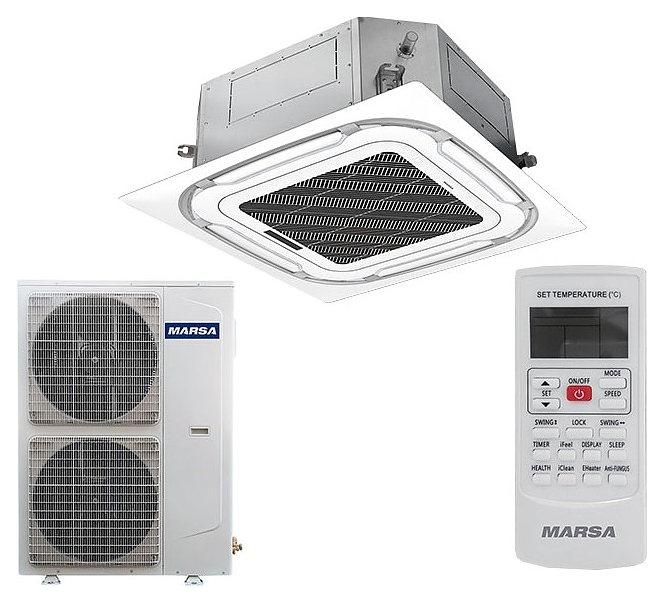 Кассетная сплит-система MARSA MRK-60UHA2N / MRK-60HA2NE-W серии OPTIMAL используется для создания максимально кофмортных условий микроклимата в административных, коммерческих и производственных помещениях. Модель состоит из наружного блока MRK-60HA2NE-W, внутреннего блока кассетного типа MRK-60UHA2N и декоративной лицевой панели UA-MB4L2. Наружный блок оснащен 2 3-лопастными вентиляторами с защитными решетками, внутренний блок – электронным блоком управления, лицевая панель – воздухозаборной решеткой, 4 подвижными направляющими воздушными заслонками и дисплеем индикации, пульт – информативным жидкокристаллическим дисплеем и кнопочной клавиатурой. Лицевая панель выполнена из пластика с поверхностью белого цвета, корпус пульта – из ударопрочного белого пластика.